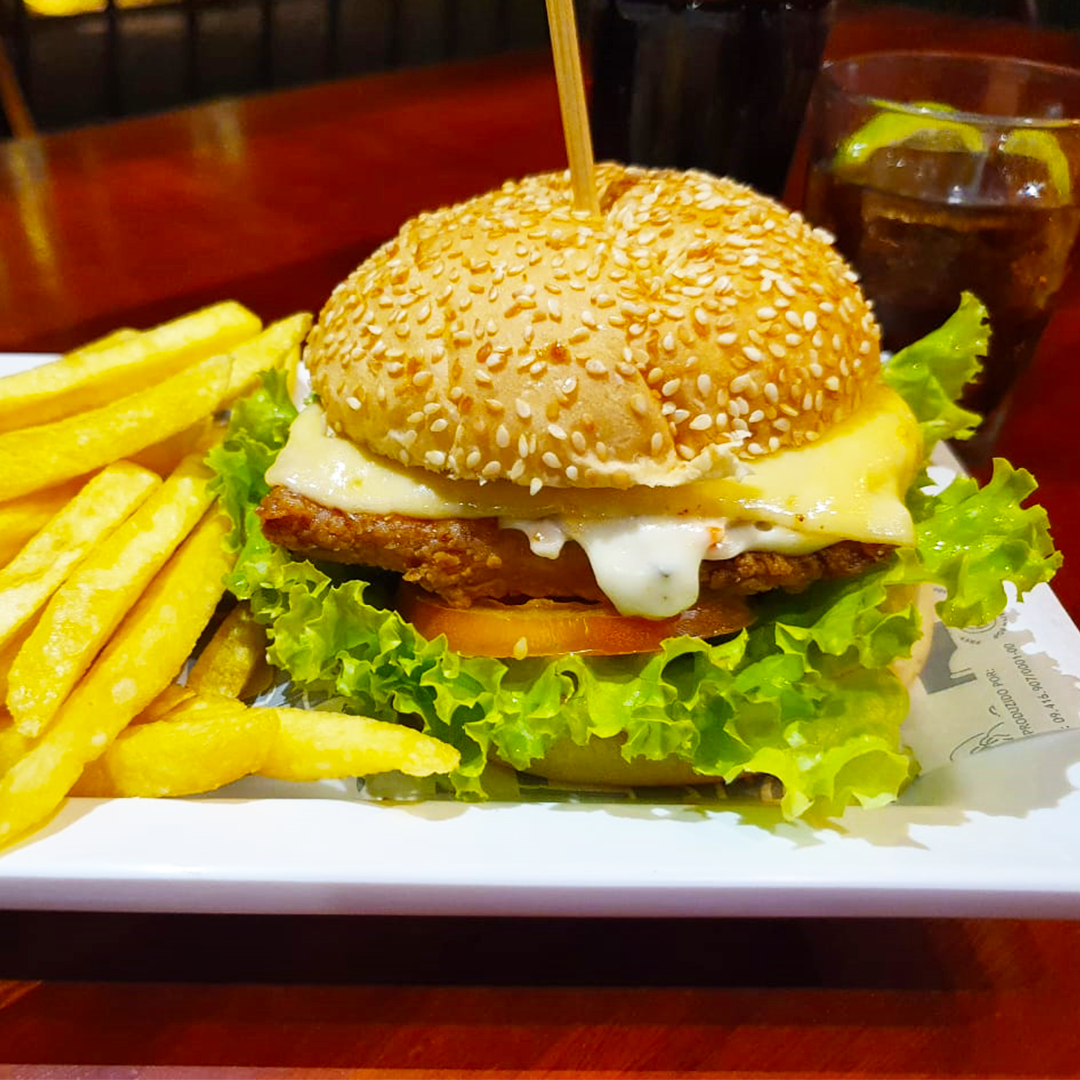 Pão c/gergelim, filé de tilapia empanado, molho tártaro, queijo prato, alface e tomate.