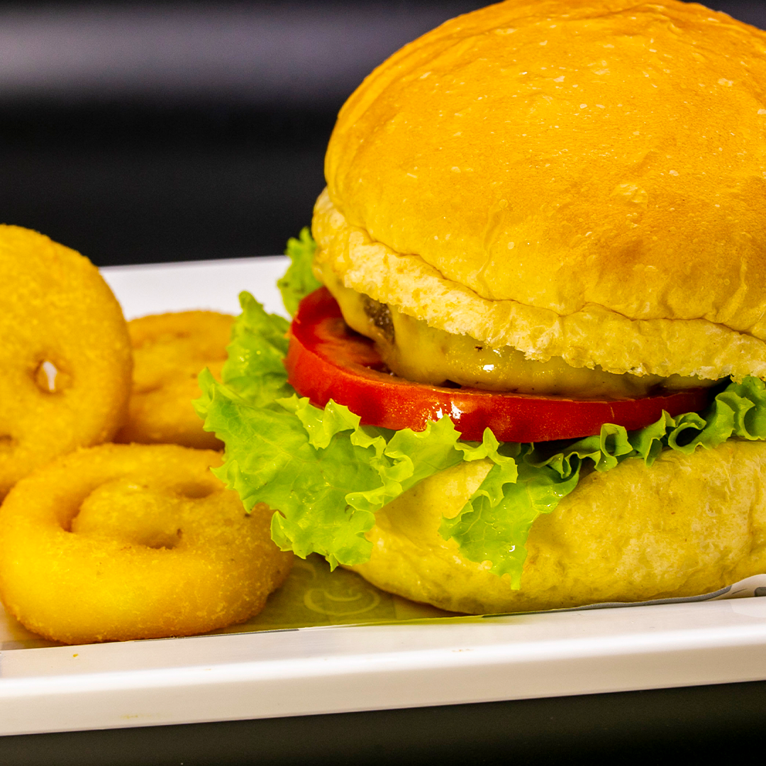 Pão, hambúrguer bovino artesanal, queijo prato, alface, tomate e batata sorriso.