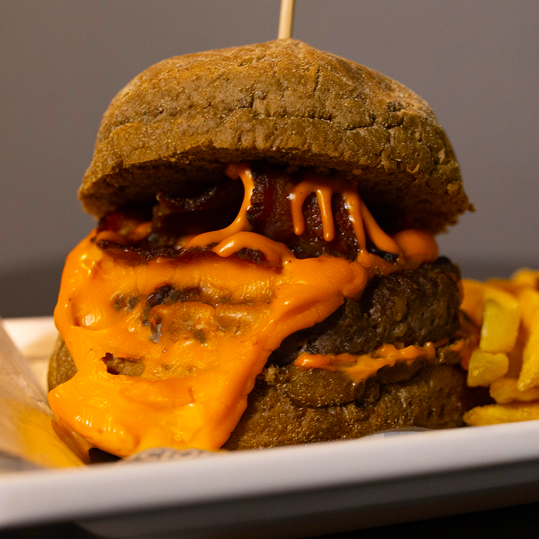Pão Australiano, hambúrguer bovino artesanal, fatias de bacon crocante, queijo cheddar e cebola caramelizada.